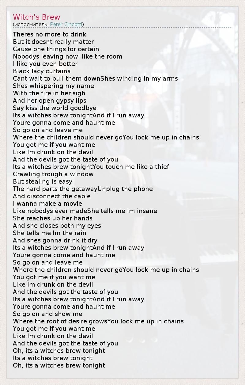 Theres no more to drink But it doesnt really matter Cause one things for certain Nobodys leaving nowI like the room I like you even better Black lacy curtains Cant wait to pull them downShes winding in my arms Shes whispering my name With the fire in her sigh And her open gypsy lips Say kiss the world goodbye Its a witches brew tonightAnd if I run away Youre gonna come and haunt me So go on and leave me Where the children should never goYou lock me up in chains You got me if you want me Like Im drunk on the devil And the devils got the taste of you Its a witches brew tonightYou touch me like a thief Crawling trough a window But stealing is easy The hard parts the getawayUnplug the phone And disconnect the cable I wanna make a movie Like nobodys ever madeShe tells me Im insane She reaches up her hands And she closes both my eyes She tells me Im the rain And shes gonna drink it dry Its a witches brew tonightAnd if I run away Youre gonna come and haunt me So go on and leave me Where the children should never goYou lock me up in chains You got me if you want me Like Im drunk on the devil And the devils got the taste of you Its a witches brew tonightAnd if I run away Youre gonna come and haunt me So go on and show me Where the root of desire growsYou lock me up in chains You got me if you want me Like Im drunk on the devil And the devils got the taste of you Oh, its a witches brew tonight Its a witches brew tonight Oh, its a witches brew tonight