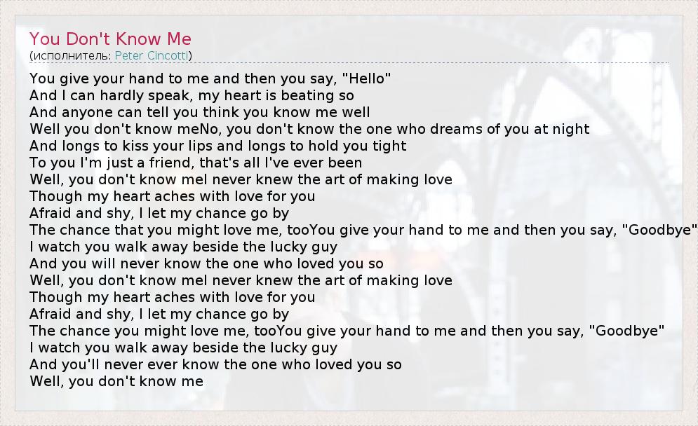 You give your hand to me and then you say, "Hello" And I can hardly speak, my heart is beating so And anyone can tell you think you know me well Well you don't know meNo, you don't know the one who dreams of you at night And longs to kiss your lips and longs to hold you tight To you I'm just a friend, that's all I've ever been Well, you don't know meI never knew the art of making love Though my heart aches with love for you Afraid and shy, I let my chance go by The chance that you might love me, tooYou give your hand to me and then you say, "Goodbye" I watch you walk away beside the lucky guy And you will never know the one who loved you so Well, you don't know meI never knew the art of making love Though my heart aches with love for you Afraid and shy, I let my chance go by The chance you might love me, tooYou give your hand to me and then you say, "Goodbye" I watch you walk away beside the lucky guy And you'll never ever know the one who loved you so Well, you don't know me