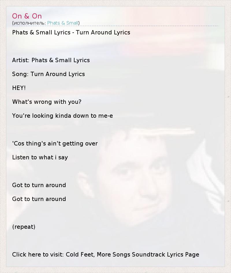 Phats & Small Lyrics - Turn Around Lyrics Artist: Phats & Small Lyrics Song: Turn Around Lyrics HEY! What's wrong with you? You're looking kinda down to me-e 'Cos thing's ain't getting over Listen to what i say Got to turn around Got to turn around (repeat) Click here to visit: Cold Feet, More Songs Soundtrack Lyrics Page