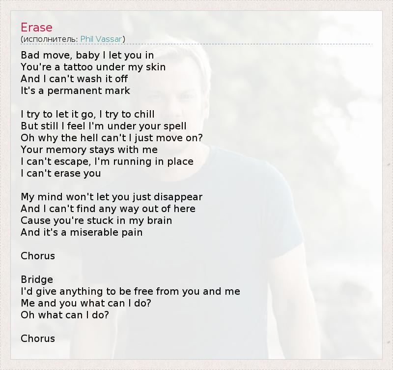 Bad move, baby I let you in You're a tattoo under my skin And I can't wash it off It's a permanent mark I try to let it go, I try to chill But still I feel I'm under your spell Oh why the hell can't I just move on? Your memory stays with me I can't escape, I'm running in place I can't erase you My mind won't let you just disappear And I can't find any way out of here Cause you're stuck in my brain And it's a miserable pain Chorus Bridge I'd give anything to be free from you and me Me and you what can I do? Oh what can I do? Chorus