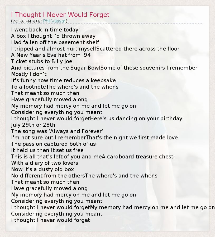 ГлавнаяИсполнителиPhil VassarI Thought I Never Would Forget