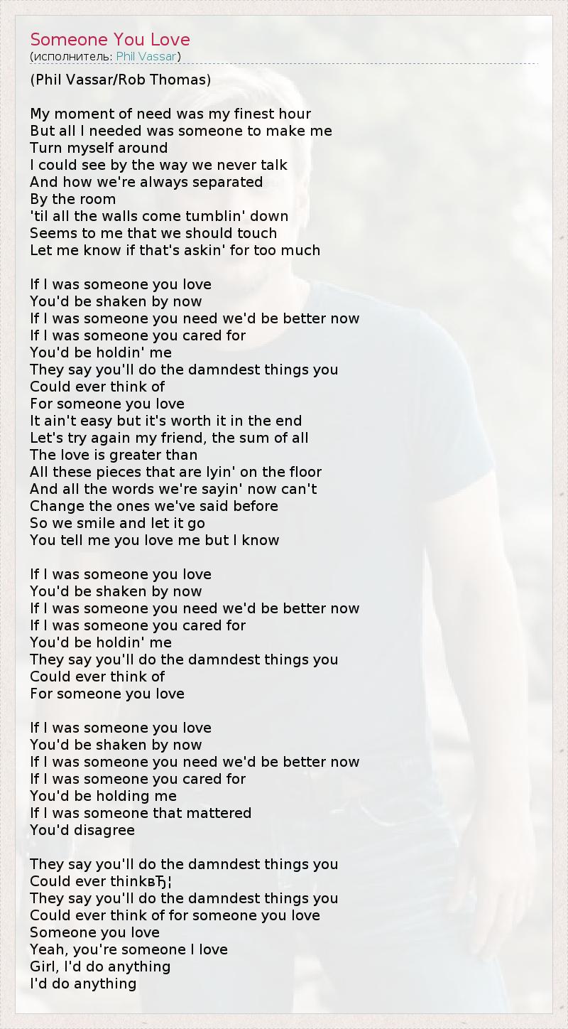 (Phil Vassar/Rob Thomas) My moment of need was my finest hour But all I needed was someone to make me Turn myself around I could see by the way we never talk And how we're always separated By the room 'til all the walls come tumblin' down Seems to me that we should touch Let me know if that's askin' for too much If I was someone you love You'd be shaken by now If I was someone you need we'd be better now If I was someone you cared for You'd be holdin' me They say you'll do the damndest things you Could ever think of For someone you love It ain't easy but it's worth it in the end Let's try again my friend, the sum of all The love is greater than All these pieces that are lyin' on the floor And all the words we're sayin' now can't Change the ones we've said before So we smile and let it go You tell me you love me but I know If I was someone you love You'd be shaken by now If I was someone you need we'd be better now If I was someone you cared for You'd be holdin' me They say you'll do the damndest things you Could ever think of For someone you love If I was someone you love You'd be shaken by now If I was someone you need we'd be better now If I was someone you cared for You'd be holding me If I was someone that mattered You'd disagree They say you'll do the damndest things you Could ever think… They say you'll do the damndest things you Could ever think of for someone you love Someone you love Yeah, you're someone I love Girl, I'd do anything I'd do anything