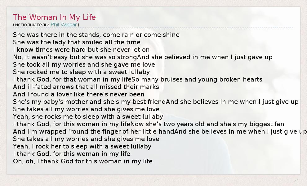 She was there in the stands, come rain or come shine She was the lady that smiled all the time I know times were hard but she never let on No, it wasn't easy but she was so strongAnd she believed in me when I just gave up She took all my worries and she gave me love She rocked me to sleep with a sweet lullaby I thank God, for that woman in my lifeSo many bruises and young broken hearts And ill-fated arrows that all missed their marks And I found a lover like there's never been She's my baby's mother and she's my best friendAnd she believes in me when I just give up She takes all my worries and she gives me love Yeah, she rocks me to sleep with a sweet lullaby I thank God, for this woman in my lifeNow she's two years old and she's my biggest fan And I'm wrapped 'round the finger of her little handAnd she believes in me when I just give up She takes all my worries and she gives me love Yeah, I rock her to sleep with a sweet lullaby I thank God, for this woman in my life Oh, oh, I thank God for this woman in my life