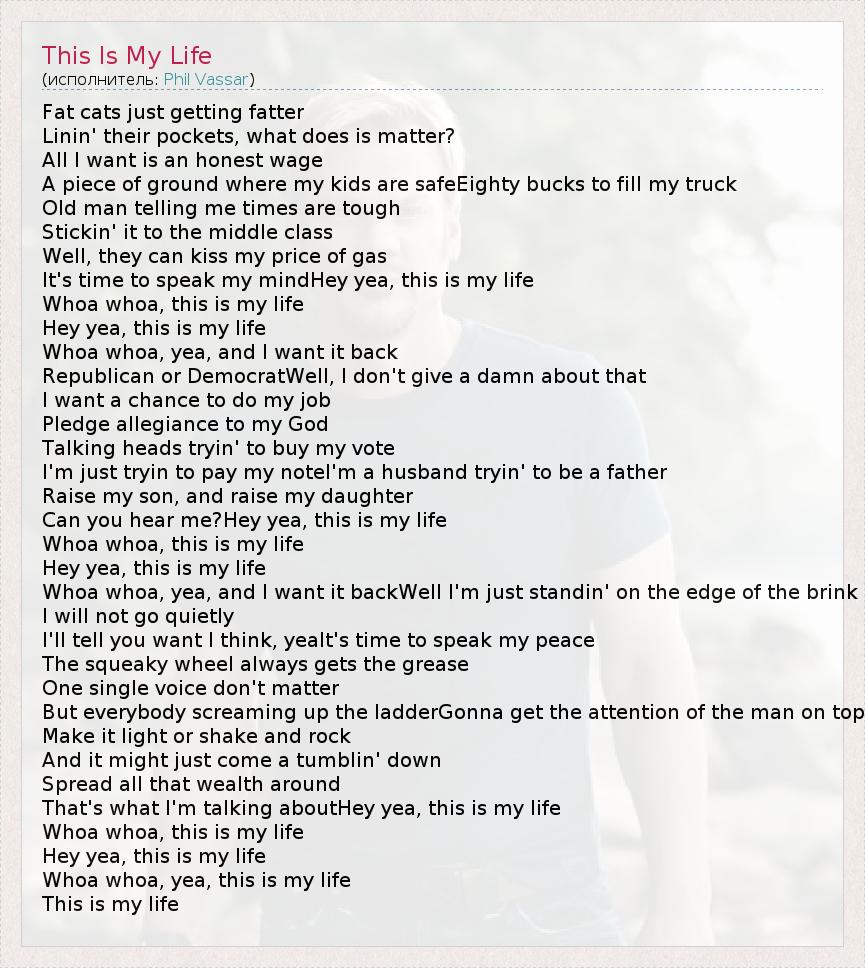 Fat cats just getting fatter Linin' their pockets, what does is matter? All I want is an honest wage A piece of ground where my kids are safeEighty bucks to fill my truck Old man telling me times are tough Stickin' it to the middle class Well, they can kiss my price of gas It's time to speak my mindHey yea, this is my life Whoa whoa, this is my life Hey yea, this is my life Whoa whoa, yea, and I want it back Republican or DemocratWell, I don't give a damn about that I want a chance to do my job Pledge allegiance to my God Talking heads tryin' to buy my vote I'm just tryin to pay my noteI'm a husband tryin' to be a father Raise my son, and raise my daughter Can you hear me?Hey yea, this is my life Whoa whoa, this is my life Hey yea, this is my life Whoa whoa, yea, and I want it backWell I'm just standin' on the edge of the brink I will not go quietly I'll tell you want I think, yeaIt's time to speak my peace The squeaky wheel always gets the grease One single voice don't matter But everybody screaming up the ladderGonna get the attention of the man on top Make it light or shake and rock And it might just come a tumblin' down Spread all that wealth around That's what I'm talking aboutHey yea, this is my life Whoa whoa, this is my life Hey yea, this is my life Whoa whoa, yea, this is my life This is my life