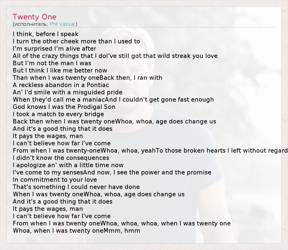 I think, before I speak I turn the other cheek more than I used to I'm surprised I'm alive after All of the crazy things that I doI've still got that wild streak you love But I'm not the man I was But I think I like me better now Than when I was twenty oneBack then, I ran with A reckless abandon in a Pontiac An' I'd smile with a misguided pride When they'd call me a maniacAnd I couldn't get gone fast enough God knows I was the Prodigal Son I took a match to every bridge Back then when I was twenty oneWhoa, whoa, age does change us And it's a good thing that it does It pays the wages, man I can't believe how far I've come From when I was twenty-oneWhoa, whoa, yeahTo those broken hearts I left without regard I didn't know the consequences I apologize an' with a little time now I've come to my sensesAnd now, I see the power and the promise In commitment to your love That's something I could never have done When I was twenty oneWhoa, whoa, age does change us And it's a good thing that it does It pays the wages, man I can't believe how far I've come From when I was twenty oneWhoa, whoa, whoa, when I was twenty one Whoa, when I was twenty oneMmm, hmm