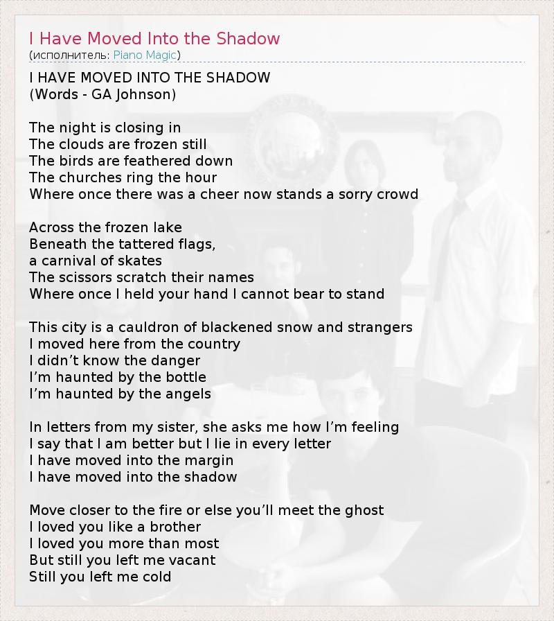 I HAVE MOVED INTO THE SHADOW (Words - GA Johnson) The night is closing in The clouds are frozen still The birds are feathered down The churches ring the hour Where once there was a cheer now stands a sorry crowd Across the frozen lake Beneath the tattered flags, a carnival of skates The scissors scratch their names Where once I held your hand I cannot bear to stand This city is a cauldron of blackened snow and strangers I moved here from the country I didn’t know the danger I’m haunted by the bottle I’m haunted by the angels In letters from my sister, she asks me how I’m feeling I say that I am better but I lie in every letter I have moved into the margin I have moved into the shadow Move closer to the fire or else you’ll meet the ghost I loved you like a brother I loved you more than most But still you left me vacant Still you left me cold