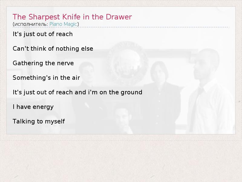 А как ты думаешь, о чем песня "The Sharpest Knife in the Drawer" ?