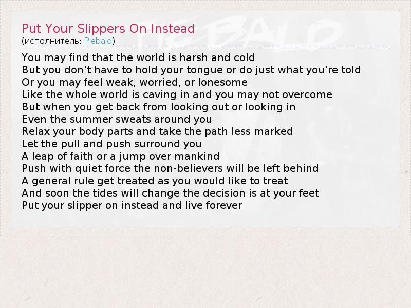 А как ты думаешь, о чем песня "Put Your Slippers On Instead" ?