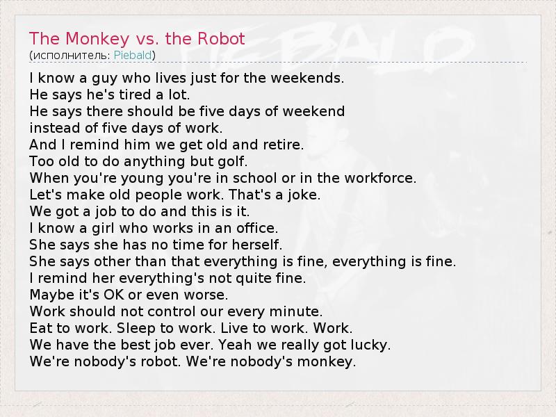 I know a guy who lives just for the weekends. He says he's tired a lot. He says there should be five days of weekend instead of five days of work. And I remind him we get old and retire. Too old to do anything but golf. When you're young you're in school or in the workforce. Let's make old people work. That's a joke. We got a job to do and this is it. I know a girl who works in an office. She says she has no time for herself. She says other than that everything is fine, everything is fine. I remind her everything's not quite fine. Maybe it's OK or even worse. Work should not control our every minute. Eat to work. Sleep to work. Live to work. Work. We have the best job ever. Yeah we really got lucky. We're nobody's robot. We're nobody's monkey.