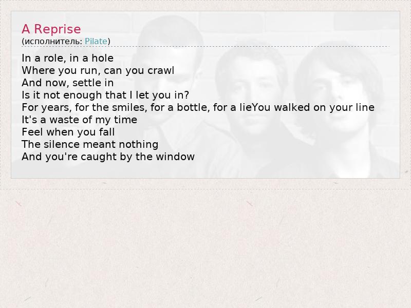 In a role, in a hole Where you run, can you crawl And now, settle in Is it not enough that I let you in? For years, for the smiles, for a bottle, for a lieYou walked on your line It's a waste of my time Feel when you fall The silence meant nothing And you're caught by the window