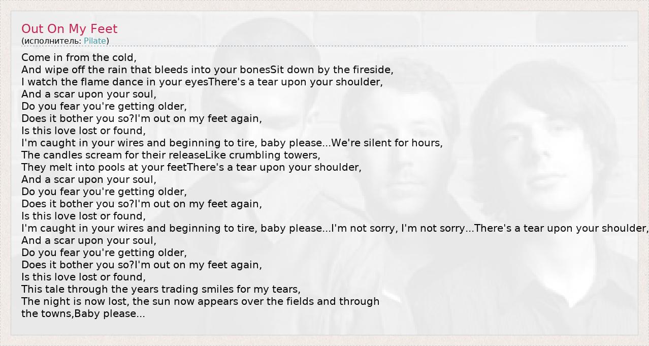 Come in from the cold, And wipe off the rain that bleeds into your bonesSit down by the fireside, I watch the flame dance in your eyesThere's a tear upon your shoulder, And a scar upon your soul, Do you fear you're getting older, Does it bother you so?I'm out on my feet again, Is this love lost or found, I'm caught in your wires and beginning to tire, baby please...We're silent for hours, The candles scream for their releaseLike crumbling towers, They melt into pools at your feetThere's a tear upon your shoulder, And a scar upon your soul, Do you fear you're getting older, Does it bother you so?I'm out on my feet again, Is this love lost or found, I'm caught in your wires and beginning to tire, baby please...I'm not sorry, I'm not sorry...There's a tear upon your shoulder, And a scar upon your soul, Do you fear you're getting older, Does it bother you so?I'm out on my feet again, Is this love lost or found, This tale through the years trading smiles for my tears, The night is now lost, the sun now appears over the fields and through the towns,Baby please...