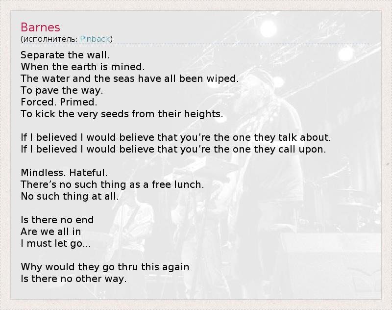 Это интересно:Pinback - indie rock группа из San Diego, CA, в данный момент подписаная на лейбле Touch and Go Records. Группа была создана в 1998 двумя певцами и мульти-инструменталистами: Армистэдом Бурвеллом Смитом Четвертым (или просто - Зак Смит) и Робом Кроу.За 10 лет существования группа записала четыре полноформатных альбома, последний из которых, The Autumn Of Seraphs, вышел... продолжение