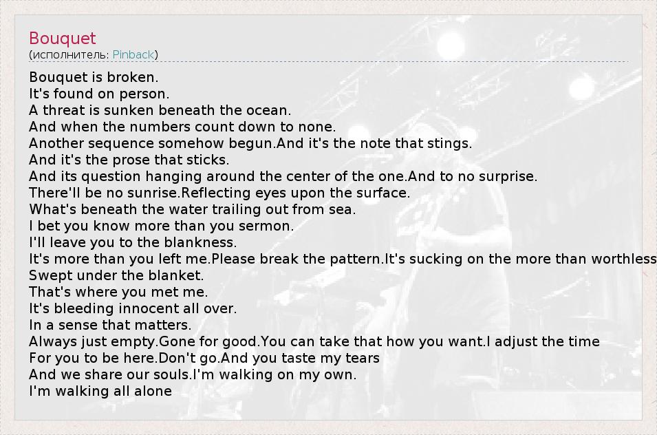 Bouquet is broken. It's found on person. A threat is sunken beneath the ocean. And when the numbers count down to none. Another sequence somehow begun.And it's the note that stings. And it's the prose that sticks. And its question hanging around the center of the one.And to no surprise. There'll be no sunrise.Reflecting eyes upon the surface. What's beneath the water trailing out from sea. I bet you know more than you sermon. I'll leave you to the blankness. It's more than you left me.Please break the pattern.It's sucking on the more than worthless Swept under the blanket. That's where you met me. It's bleeding innocent all over. In a sense that matters. Always just empty.Gone for good.You can take that how you want.I adjust the time For you to be here.Don't go.And you taste my tears And we share our souls.I'm walking on my own. I'm walking all alone