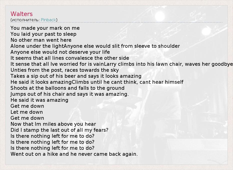 You made your mark on me You laid your past to sleep No other man went here Alone under the lightAnyone else would slit from sleeve to shoulder Anyone else would not deserve your life It seems that all lines convalesce the other side It sense that all Ive worried for is vainLarry climbs into his lawn chair, waves her goodbye Unties from the post, races towards the sky Takes a sip out of his beer and says it looks amazing He said it looks amazingClimbs until he cant think, cant hear himself Shoots at the balloons and falls to the ground Jumps out of his chair and says it was amazing. He said it was amazing Get me down Let me down Get me down Now that Im miles above you hear Did I stamp the last out of all my fears? Is there nothing left for me to do? Is there nothing left for me to do? Is there nothing left for me to do? Went out on a hike and he never came back again.