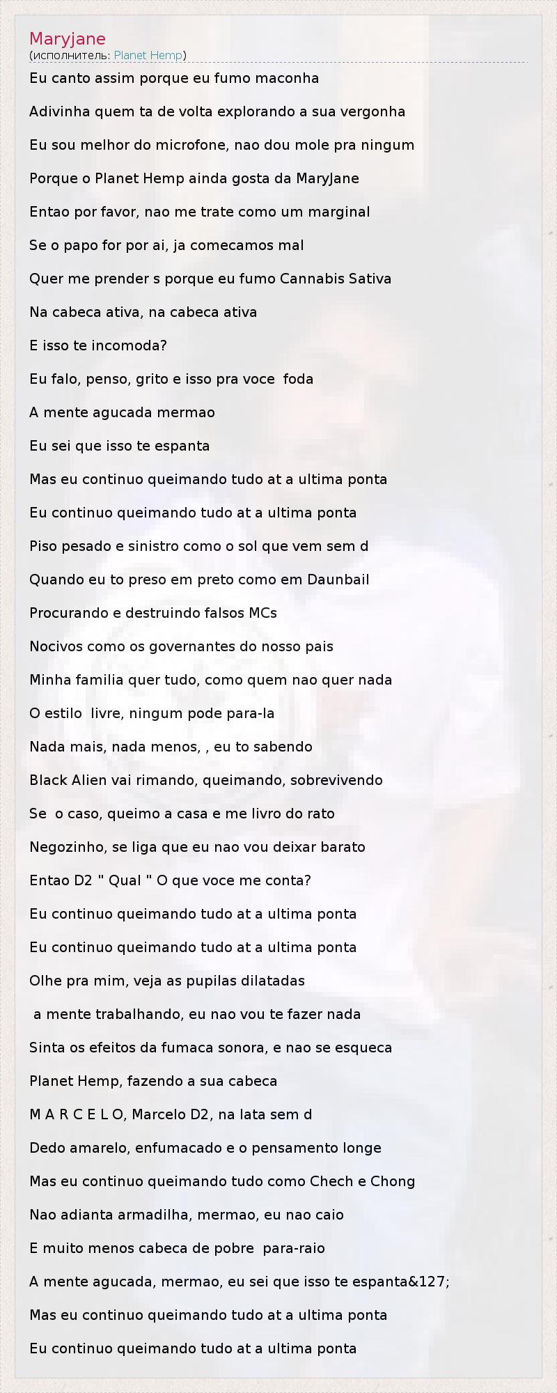 Это интересно:Planet Hemp was a Brazilian hip hop/rapcore musical group, known for starting the career of rapper Marcelo D2 and for its lyrics supporting the legality of cannabis. The band was founded in Rio de Janeiro in 1993, with original members Marcelo D2, Skunk, Rafael, Formigão and Bacalhau.The band broke up in 2001 due to differences between the band members, and Marcelo D2's increasing focus on his solo projects.