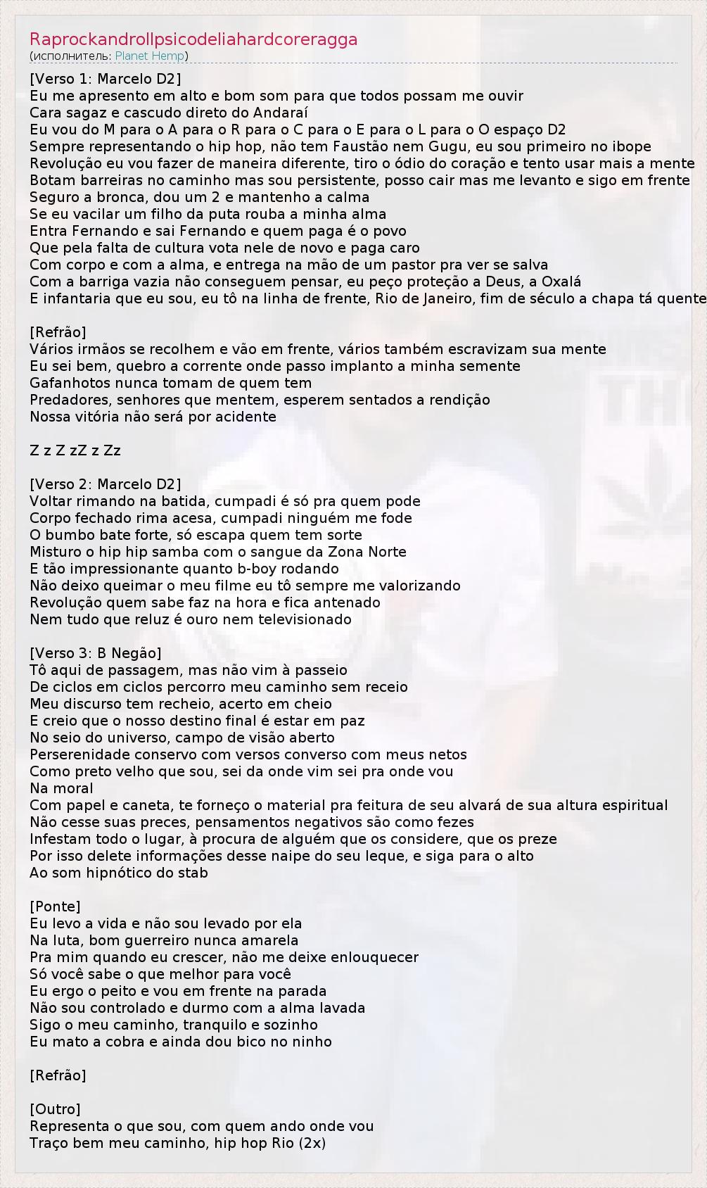 [Verso 1: Marcelo D2] Eu me apresento em alto e bom som para que todos possam me ouvir Cara sagaz e cascudo direto do Andaraí Eu vou do M para o A para o R para o C para o E para o L para o O espaço D2 Sempre representando o hip hop, não tem Faustão nem Gugu, eu sou primeiro no ibope Revolução eu vou fazer de maneira diferente, tiro o ódio do coração e tento usar mais a mente Botam barreiras no caminho mas sou persistente, posso cair mas me levanto e sigo em frente Seguro a bronca, dou um 2 e mantenho a calma Se eu vacilar um filho da puta rouba a minha alma Entra Fernando e sai Fernando e quem paga é o povo Que pela falta de cultura vota nele de novo e paga caro Com corpo e com a alma, e entrega na mão de um pastor pra ver se salva Com a barriga vazia não conseguem pensar, eu peço proteção a Deus, a Oxalá E infantaria que eu sou, eu tô na linha de frente, Rio de Janeiro, fim de século a chapa tá quente [Refrão] Vários irmãos se recolhem e vão em frente, vários também escravizam sua mente Eu sei bem, quebro a corrente onde passo implanto a minha semente Gafanhotos nunca tomam de quem tem Predadores, senhores que mentem, esperem sentados a rendição Nossa vitória não será por acidente Z z Z zZ z Zz [Verso 2: Marcelo D2] Voltar rimando na batida, cumpadi é só pra quem pode Corpo fechado rima acesa, cumpadi ninguém me fode O bumbo bate forte, só escapa quem tem sorte Misturo o hip hip samba com o sangue da Zona Norte E tão impressionante quanto b-boy rodando Não deixo queimar o meu filme eu tô sempre me valorizando Revolução quem sabe faz na hora e fica antenado Nem tudo que reluz é ouro nem televisionado [Verso 3: B Negão] Tô aqui de passagem, mas não vim à passeio De ciclos em ciclos percorro meu caminho sem receio Meu discurso tem recheio, acerto em cheio E creio que o nosso destino final é estar em paz No seio do universo, campo de visão aberto Perserenidade conservo com versos converso com meus netos Como preto velho que sou, sei da onde vim sei pra onde vou Na moral Com papel e caneta, te forneço o material pra feitura de seu alvará de sua altura espiritual Não cesse suas preces, pensamentos negativos são como fezes Infestam todo o lugar, à procura de alguém que os considere, que os preze Por isso delete informações desse naipe do seu leque, e siga para o alto Ao som hipnótico do stab [Ponte] Eu levo a vida e não sou levado por ela Na luta, bom guerreiro nunca amarela Pra mim quando eu crescer, não me deixe enlouquecer Só você sabe o que melhor para você Eu ergo o peito e vou em frente na parada Não sou controlado e durmo com a alma lavada Sigo o meu caminho, tranquilo e sozinho Eu mato a cobra e ainda dou bico no ninho [Refrão] [Outro] Representa o que sou, com quem ando onde vou Traço bem meu caminho, hip hop Rio (2x)