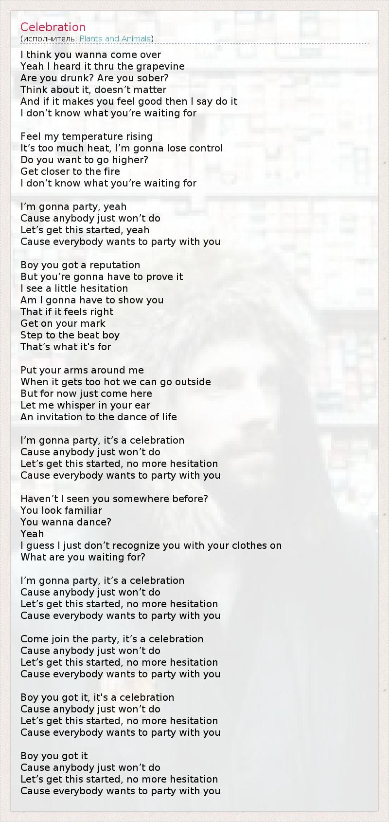 I think you wanna come over Yeah I heard it thru the grapevine Are you drunk? Are you sober? Think about it, doesn’t matter And if it makes you feel good then I say do it I don’t know what you’re waiting for Feel my temperature rising It’s too much heat, I’m gonna lose control Do you want to go higher? Get closer to the fire I don’t know what you’re waiting for I’m gonna party, yeah Cause anybody just won’t do Let’s get this started, yeah Cause everybody wants to party with you Boy you got a reputation But you’re gonna have to prove it I see a little hesitation Am I gonna have to show you That if it feels right Get on your mark Step to the beat boy That’s what it's for Put your arms around me When it gets too hot we can go outside But for now just come here Let me whisper in your ear An invitation to the dance of life I’m gonna party, it’s a celebration Cause anybody just won’t do Let’s get this started, no more hesitation Cause everybody wants to party with you Haven’t I seen you somewhere before? You look familiar You wanna dance? Yeah I guess I just don’t recognize you with your clothes on What are you waiting for? I’m gonna party, it’s a celebration Cause anybody just won’t do Let’s get this started, no more hesitation Cause everybody wants to party with you Come join the party, it’s a celebration Cause anybody just won’t do Let’s get this started, no more hesitation Cause everybody wants to party with you Boy you got it, it's a celebration Cause anybody just won’t do Let’s get this started, no more hesitation Cause everybody wants to party with you Boy you got it Cause anybody just won’t do Let’s get this started, no more hesitation Cause everybody wants to party with you