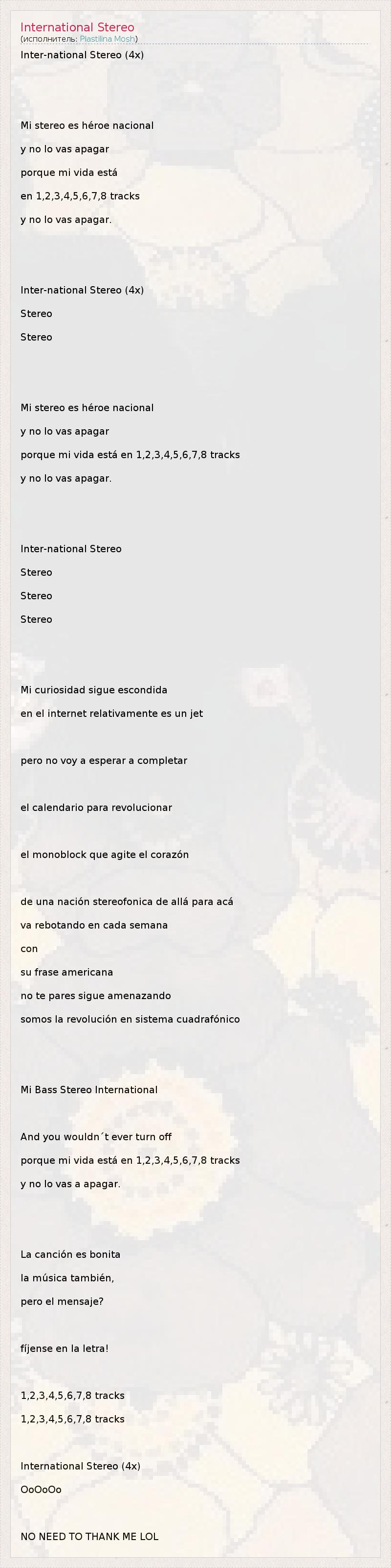 Это интересно:The band was formed in 1996 by Jonás Gonzalez and Alejandro Rosso. They met in Monterrey while playing Super Nintendo at a Wal-Mart.Their previous musical experiences were very opposite: González came from a thrash-metal band called Koervoz de Malta, and Rosso from an avant-garde group called Acarnienses. Jonas liked Sepultura, Soda Stereo, and Mano Negra; whereas Rosso liked Antonio Carlos Jobim, John Coltrane and a varied assortment of classical music.Back in early 1997, Plastilina traveled to Mexico City, where they recorded the video and the single of Niño Bomba, released under the independent label Tómbola! Recordings, which sold 5000 copies. Then, they started to get attention... продолжение