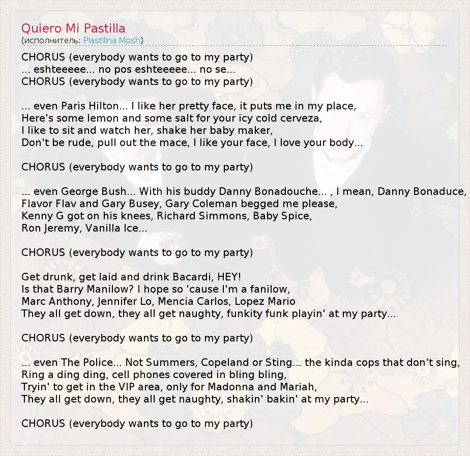 CHORUS (everybody wants to go to my party) ... eshteeeee... no pos eshteeeee... no se... CHORUS (everybody wants to go to my party) ... even Paris Hilton... I like her pretty face, it puts me in my place, Here's some lemon and some salt for your icy cold cerveza, I like to sit and watch her, shake her baby maker, Don't be rude, pull out the mace, I like your face, I love your body... CHORUS (everybody wants to go to my party) ... even George Bush... With his buddy Danny Bonadouche... , I mean, Danny Bonaduce, Flavor Flav and Gary Busey, Gary Coleman begged me please, Kenny G got on his knees, Richard Simmons, Baby Spice, Ron Jeremy, Vanilla Ice... CHORUS (everybody wants to go to my party) Get drunk, get laid and drink Bacardi, HEY! Is that Barry Manilow? I hope so 'cause I'm a fanilow, Marc Anthony, Jennifer Lo, Mencia Carlos, Lopez Mario They all get down, they all get naughty, funkity funk playin' at my party... CHORUS (everybody wants to go to my party) ... even The Police... Not Summers, Copeland or Sting... the kinda cops that don't sing, Ring a ding ding, cell phones covered in bling bling, Tryin' to get in the VIP area, only for Madonna and Mariah, They all get down, they all get naughty, shakin' bakin' at my party... CHORUS (everybody wants to go to my party)