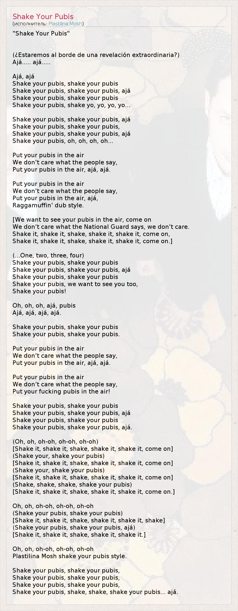 "Shake Your Pubis" (¿Estaremos al borde de una revelación extraordinaria?) Ajá..... ajá..... Ajá, ajá Shake your pubis, shake your pubis Shake your pubis, shake your pubis, ajá Shake your pubis, shake your pubis Shake your pubis, shake yo, yo, yo, yo... Shake your pubis, shake your pubis, ajá Shake your pubis, shake your pubis, Shake your pubis, shake your pubis, ajá Shake your pubis, oh, oh, oh, oh... Put your pubis in the air We don't care what the people say, Put your pubis in the air, ajá, ajá. Put your pubis in the air We don't care what the people say, Put your pubis in the air, ajá, Raggamuffin' dub style. [We want to see your pubis in the air, come on We don't care what the National Guard says, we don't care. Shake it, shake it, shake, shake it, shake it, come on, Shake it, shake it, shake, shake it, shake it, come on.] (...One, two, three, four) Shake your pubis, shake your pubis Shake your pubis, shake your pubis, ajá Shake your pubis, shake your pubis Shake your pubis, we want to see you too, Shake your pubis! Oh, oh, oh, ajá, pubis Ajá, ajá, ajá, ajá. Shake your pubis, shake your pubis Shake your pubis, shake your pubis. Put your pubis in the air We don't care what the people say, Put your pubis in the air, ajá, ajá. Put your pubis in the air We don't care what the people say, Put your fucking pubis in the air! Shake your pubis, shake your pubis Shake your pubis, shake your pubis, ajá Shake your pubis, shake your pubis Shake your pubis, shake your pubis, ajá. (Oh, oh, oh-oh, oh-oh, oh-oh) [Shake it, shake it, shake, shake it, shake it, come on] (Shake your, shake your pubis) [Shake it, shake it, shake, shake it, shake it, come on] (Shake your, shake your pubis) [Shake it, shake it, shake, shake it, shake it, come on] (Shake, shake, shake, shake your pubis) [Shake it, shake it, shake, shake it, shake it, come on.] Oh, oh, oh-oh, oh-oh, oh-oh (Shake your pubis, shake your pubis) [Shake it, shake it, shake, shake it, shake it, shake] (Shake your pubis, shake your pubis, ajá) [Shake it, shake it, shake, shake it, shake it.] Oh, oh, oh-oh, oh-oh, oh-oh Plastilina Mosh shake your pubis style. Shake your pubis, shake your pubis, Shake your pubis, shake your pubis, Shake your pubis, shake your pubis, Shake your pubis, shake, shake, shake your pubis... ajá.