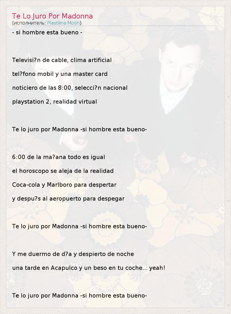 - si hombre esta bueno - Televisi?n de cable, clima artificial tel?fono mobil y una master card noticiero de las 8:00, selecci?n nacional playstation 2, realidad virtual Te lo juro por Madonna -si hombre esta bueno- 6:00 de la ma?ana todo es igual el horoscopo se aleja de la realidad Coca-cola y Marlboro para despertar y despu?s al aeropuerto para despegar Te lo juro por Madonna -si hombre esta bueno- Y me duermo de d?a y despierto de noche una tarde en Acapulco y un beso en tu coche... yeah! Te lo juro por Madonna -si hombre esta bueno-