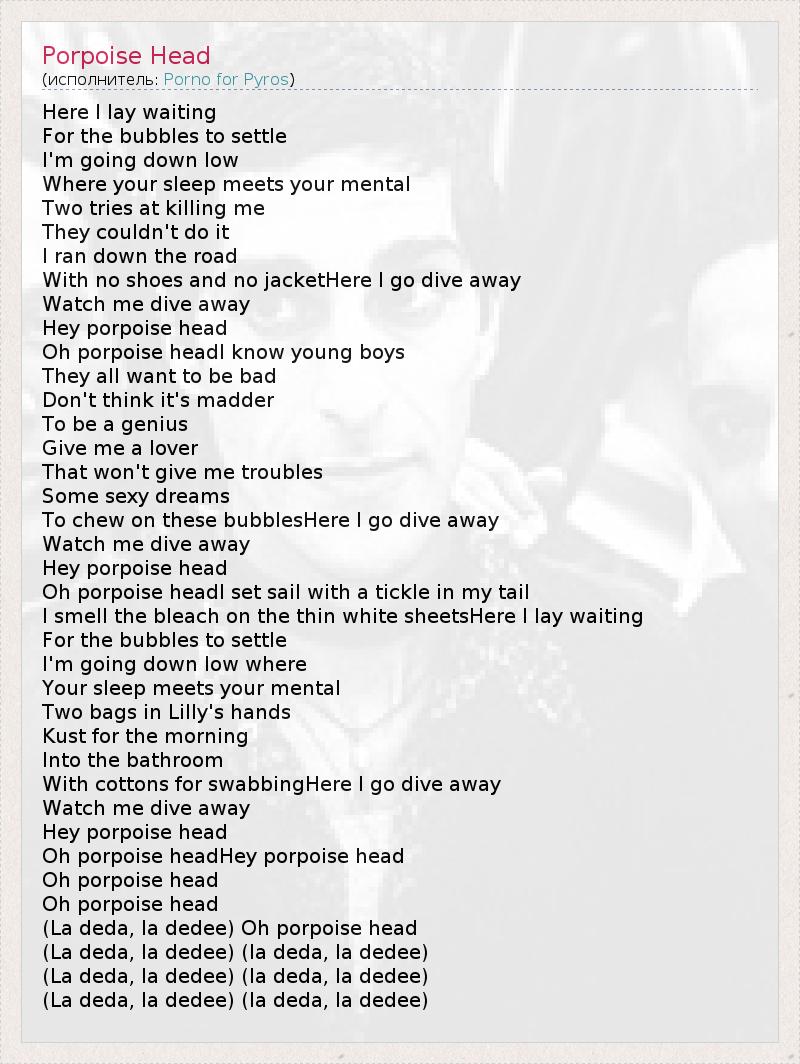 Here I lay waiting For the bubbles to settle I'm going down low Where your sleep meets your mental Two tries at killing me They couldn't do it I ran down the road With no shoes and no jacketHere I go dive away Watch me dive away Hey porpoise head Oh porpoise headI know young boys They all want to be bad Don't think it's madder To be a genius Give me a lover That won't give me troubles Some sexy dreams To chew on these bubblesHere I go dive away Watch me dive away Hey porpoise head Oh porpoise headI set sail with a tickle in my tail I smell the bleach on the thin white sheetsHere I lay waiting For the bubbles to settle I'm going down low where Your sleep meets your mental Two bags in Lilly's hands Kust for the morning Into the bathroom With cottons for swabbingHere I go dive away Watch me dive away Hey porpoise head Oh porpoise headHey porpoise head Oh porpoise head Oh porpoise head (La deda, la dedee) Oh porpoise head (La deda, la dedee) (la deda, la dedee) (La deda, la dedee) (la deda, la dedee) (La deda, la dedee) (la deda, la dedee)