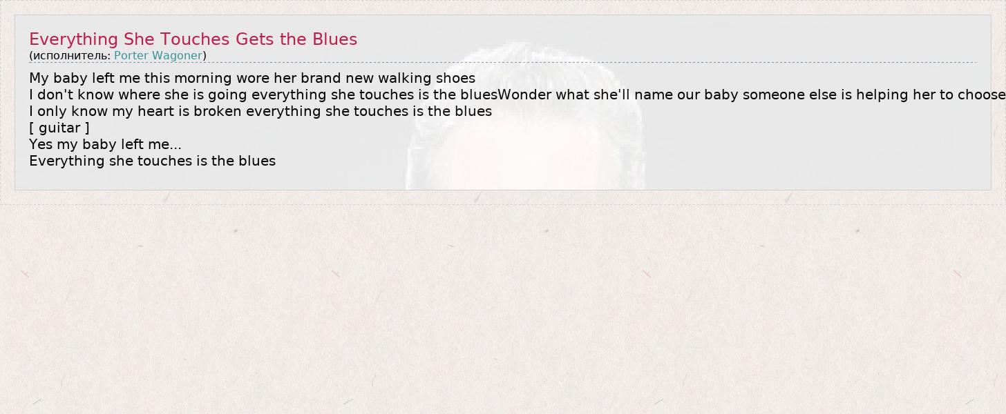 My baby left me this morning wore her brand new walking shoes I don't know where she is going everything she touches is the bluesWonder what she'll name our baby someone else is helping her to choose I only know my heart is broken everything she touches is the blues [ guitar ] Yes my baby left me... Everything she touches is the blues