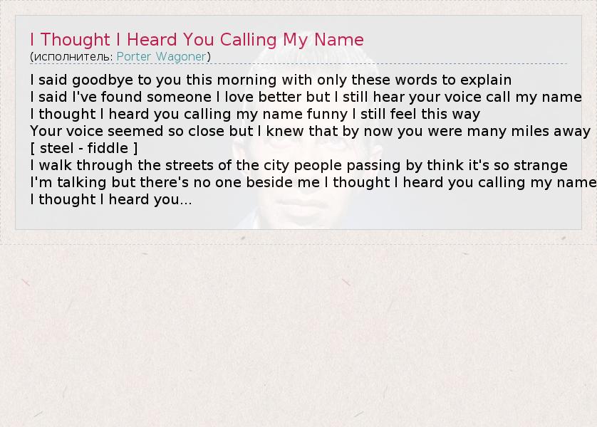 I said goodbye to you this morning with only these words to explain I said I've found someone I love better but I still hear your voice call my name I thought I heard you calling my name funny I still feel this way Your voice seemed so close but I knew that by now you were many miles away [ steel - fiddle ] I walk through the streets of the city people passing by think it's so strange I'm talking but there's no one beside me I thought I heard you calling my name I thought I heard you...