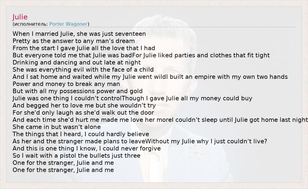 When I married Julie, she was just seventeen Pretty as the answer to any man's dream From the start I gave Julie all the love that I had But everyone told me that Julie was badFor Julie liked parties and clothes that fit tight Drinking and dancing and out late at night She was everything evil with the face of a child And I sat home and waited while my Julie went wildI built an empire with my own two hands Power and money to break any man But with all my possessions power and gold Julie was one thing I couldn't controlThough I gave Julie all my money could buy And begged her to love me but she wouldn't try For she'd only laugh as she'd walk out the door And each time she'd hurt me made me love her moreI couldn't sleep until Julie got home last night She came in but wasn't alone The things that I heard, I could hardly believe As her and the stranger made plans to leaveWithout my Julie why I just couldn't live? And this is one thing I know, I could never forgive So I wait with a pistol the bullets just three One for the stranger, Julie and me One for the stranger, Julie and me