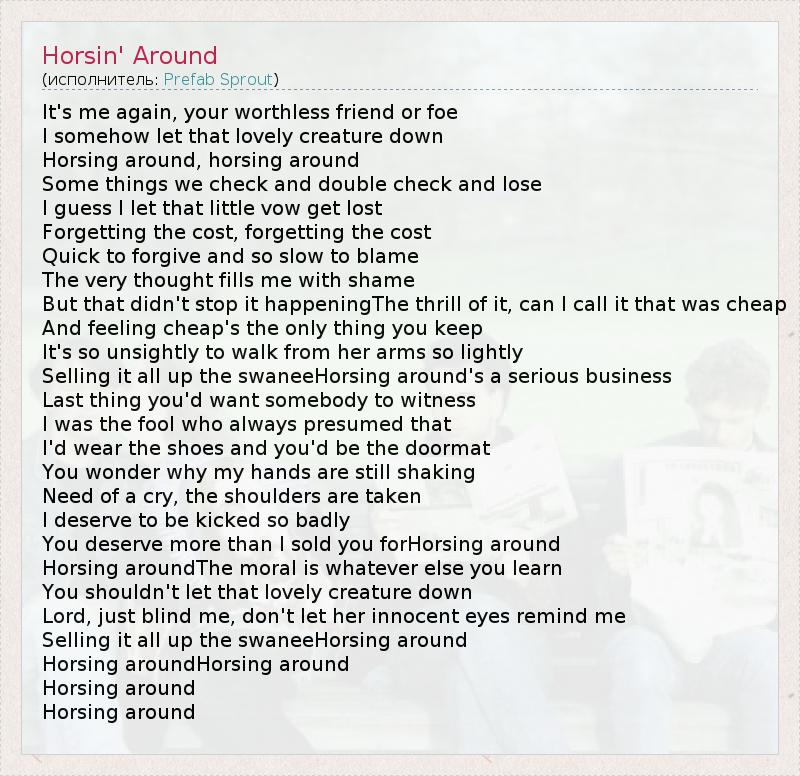 It's me again, your worthless friend or foe I somehow let that lovely creature down Horsing around, horsing around Some things we check and double check and lose I guess I let that little vow get lost Forgetting the cost, forgetting the cost Quick to forgive and so slow to blame The very thought fills me with shame But that didn't stop it happeningThe thrill of it, can I call it that was cheap And feeling cheap's the only thing you keep It's so unsightly to walk from her arms so lightly Selling it all up the swaneeHorsing around's a serious business Last thing you'd want somebody to witness I was the fool who always presumed that I'd wear the shoes and you'd be the doormat You wonder why my hands are still shaking Need of a cry, the shoulders are taken I deserve to be kicked so badly You deserve more than I sold you forHorsing around Horsing aroundThe moral is whatever else you learn You shouldn't let that lovely creature down Lord, just blind me, don't let her innocent eyes remind me Selling it all up the swaneeHorsing around Horsing aroundHorsing around Horsing around Horsing around