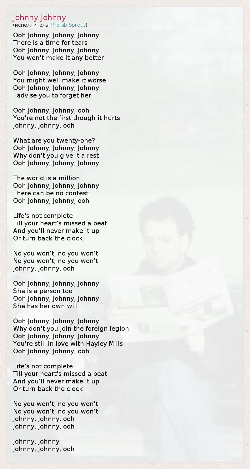 Ooh Johnny, Johnny, Johnny There is a time for tears Ooh Johnny, Johnny, Johnny You won't make it any better Ooh Johnny, Johnny, Johnny You might well make it worse Ooh Johnny, Johnny, Johnny I advise you to forget her Ooh Johnny, Johnny, ooh You're not the first though it hurts Johnny, Johnny, ooh What are you twenty-one? Ooh Johnny, Johnny, Johnny Why don't you give it a rest Ooh Johnny, Johnny, Johnny The world is a million Ooh Johnny, Johnny, Johnny There can be no contest Ooh Johnny, Johnny, ooh Life's not complete Till your heart's missed a beat And you'll never make it up Or turn back the clock No you won't, no you won't No you won't, no you won't Johnny, Johnny, ooh Ooh Johnny, Johnny, Johnny She is a person too Ooh Johnny, Johnny, Johnny She has her own will Ooh Johnny, Johnny, Johnny Why don't you join the foreign legion Ooh Johnny, Johnny, Johnny You're still in love with Hayley Mills Ooh Johnny, Johnny, ooh Life's not complete Till your heart's missed a beat And you'll never make it up Or turn back the clock No you won't, no you won't No you won't, no you won't Johnny, Johnny, ooh Johnny, Johnny, ooh Johnny, Johnny Johnny, Johnny, ooh