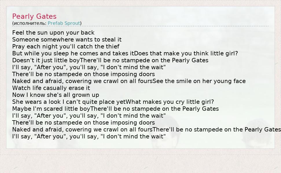 А как ты думаешь, о чем песня "Pearly Gates" ?