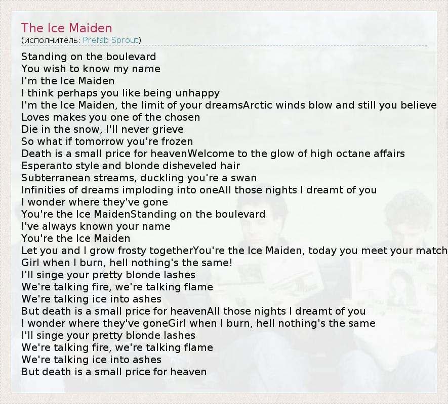 Standing on the boulevard You wish to know my name I'm the Ice Maiden I think perhaps you like being unhappy I'm the Ice Maiden, the limit of your dreamsArctic winds blow and still you believe Loves makes you one of the chosen Die in the snow, I'll never grieve So what if tomorrow you're frozen Death is a small price for heavenWelcome to the glow of high octane affairs Esperanto style and blonde disheveled hair Subterranean streams, duckling you're a swan Infinities of dreams imploding into oneAll those nights I dreamt of you I wonder where they've gone You're the Ice MaidenStanding on the boulevard I've always known your name You're the Ice Maiden Let you and I grow frosty togetherYou're the Ice Maiden, today you meet your match Girl when I burn, hell nothing's the same! I'll singe your pretty blonde lashes We're talking fire, we're talking flame We're talking ice into ashes But death is a small price for heavenAll those nights I dreamt of you I wonder where they've goneGirl when I burn, hell nothing's the same I'll singe your pretty blonde lashes We're talking fire, we're talking flame We're talking ice into ashes But death is a small price for heaven