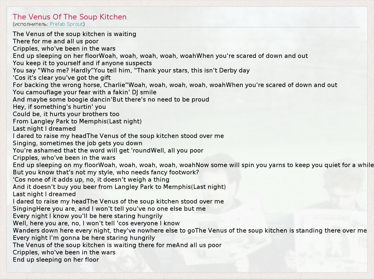 А как ты думаешь, о чем песня "The Venus Of The Soup Kitchen" ?