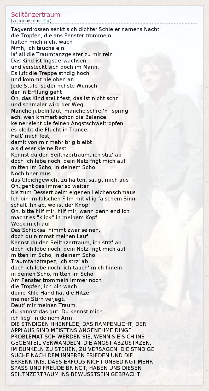 Tagverdrossen senkt sich dichter Schleier namens Nacht die Tropfen, die ans Fenster trommeln halten mich nicht wach Mmh, ich tauche ein la' all die Traumtanzgeister zu mir rein. Das Kind ist lngst erwachsen und versteckt sich doch im Mann. Es luft die Treppe stndig hoch und kommt nie oben an. Jede Stufe ist der nchste Wunsch der in Erfllung geht Oh, das Kind stellt fest, das ist nicht schn und schmaler wird der Weg. Manche jubeln laut, manche schrei'n "spring" ach, wen kmmert schon die Balance keiner sieht die feinen Angstschweitropfen es bleibt die Flucht in Trance. Halt' mich fest, damit von mir mehr brig bleibt als dieser kleine Rest. Kennst du den Seiltnzertraum, ich strz' ab doch ich lebe noch, dein Netz fngt mich auf mitten im Scho, in deinem Scho. Noch hher raus das Gleichgewicht zu halten, saugt mich aus Oh, geht das immer so weiter bis zum Dessert beim eigenen Leichenschmaus. Ich bin im falschen Film mit vllig falschem Sinn schalt ihn ab, wo ist der Knopf Oh, bitte hilf mir, hilf mir, wann denn endlich macht es "klick" in meinem Kopf. Weck mich auf Das Schicksal nimmt zwar seinen, doch du nimmst meinen Lauf. Kennst du den Seiltnzertraum, ich strz' ab doch ich lebe noch, dein Netz fngt mich auf mitten im Scho, in deinem Scho. Traumtanztrapez, ich strz' ab doch ich lebe noch, ich tauch' mich hinein in deinen Scho, mitten im Scho. Am Fenster trommeln immer noch die Tropfen, ich bin wach deine Khle Hand hat die Hitze meiner Stirn verjagt. Deut' mir meinen Traum, du kannst das gut. Du kennst mich ich lieg' in deinem Arm. DIE STNDIGEN HHENFLGE, DAS RAMPENLICHT, DER APPLAUS SIND MEISTENS ANGENEHME DINGE. PROBLEMATISCH WERDEN SIE, WENN SIE SICH INS GEGENTEIL VERWANDELN. DIE ANGST ABZUSTRZEN, IM DUNKELN ZU STEHEN, ZU VERSAGEN. DIE STNDIGE SUCHE NACH DEM INNEREN FRIEDEN UND DIE ERKENNTNIS, DASS ERFOLG NICHT UNBEDINGT MEHR SPASS UND FREUDE BRINGT, HABEN UNS DIESEN SEILTNZERTRAUM INS BEWUSSTSEIN GEBRACHT.