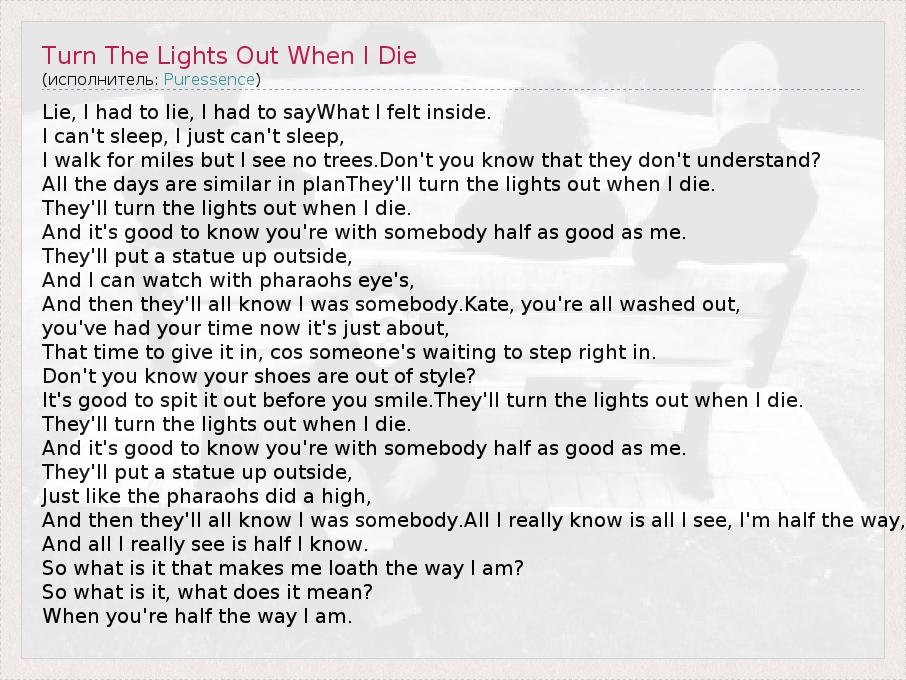 А как ты думаешь, о чем песня "Turn The Lights Out When I Die" ?