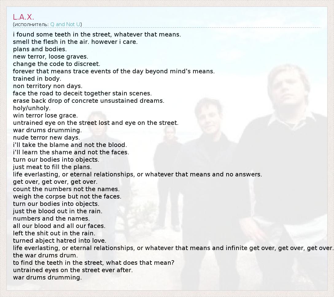 Это интересно:Q and Not U - были пост-хардкор группой из Вашингтона, округ Колумбия, имевшей контракт с Dischord Records. Джон Дэвис, Харрис Клар, Кристофер Ричардс и Мэтт Борлик (участвовал в записи первого альбома группы) основали группу в 1998 году. После ухода Борлика , группа приступила к записи еще двух долгоиграющих пластинок, основанных на аспекте dance-punk, и других различных музыкальных стилей. Q and Not U окончательно... продолжение