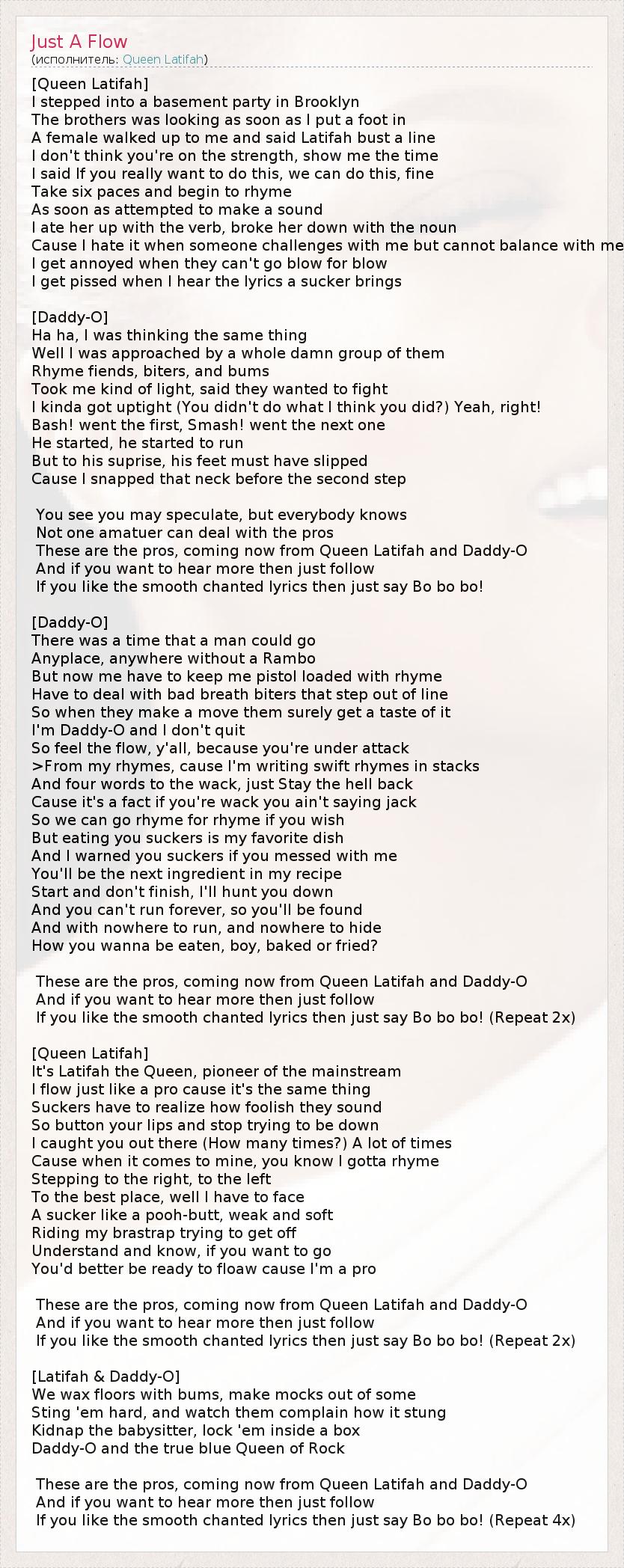[Queen Latifah] I stepped into a basement party in Brooklyn The brothers was looking as soon as I put a foot in A female walked up to me and said Latifah bust a line I don't think you're on the strength, show me the time I said If you really want to do this, we can do this, fine Take six paces and begin to rhyme As soon as attempted to make a sound I ate her up with the verb, broke her down with the noun Cause I hate it when someone challenges with me but cannot balance with me I get annoyed when they can't go blow for blow I get pissed when I hear the lyrics a sucker brings [Daddy-O] Ha ha, I was thinking the same thing Well I was approached by a whole damn group of them Rhyme fiends, biters, and bums Took me kind of light, said they wanted to fight I kinda got uptight (You didn't do what I think you did?) Yeah, right! Bash! went the first, Smash! went the next one He started, he started to run But to his suprise, his feet must have slipped Cause I snapped that neck before the second step You see you may speculate, but everybody knows Not one amatuer can deal with the pros These are the pros, coming now from Queen Latifah and Daddy-O And if you want to hear more then just follow If you like the smooth chanted lyrics then just say Bo bo bo! [Daddy-O] There was a time that a man could go Anyplace, anywhere without a Rambo But now me have to keep me pistol loaded with rhyme Have to deal with bad breath biters that step out of line So when they make a move them surely get a taste of it I'm Daddy-O and I don't quit So feel the flow, y'all, because you're under attack >From my rhymes, cause I'm writing swift rhymes in stacks And four words to the wack, just Stay the hell back Cause it's a fact if you're wack you ain't saying jack So we can go rhyme for rhyme if you wish But eating you suckers is my favorite dish And I warned you suckers if you messed with me You'll be the next ingredient in my recipe Start and don't finish, I'll hunt you down And you can't run forever, so you'll be found And with nowhere to run, and nowhere to hide How you wanna be eaten, boy, baked or fried? These are the pros, coming now from Queen Latifah and Daddy-O And if you want to hear more then just follow If you like the smooth chanted lyrics then just say Bo bo bo! (Repeat 2x) [Queen Latifah] It's Latifah the Queen, pioneer of the mainstream I flow just like a pro cause it's the same thing Suckers have to realize how foolish they sound So button your lips and stop trying to be down I caught you out there (How many times?) A lot of times Cause when it comes to mine, you know I gotta rhyme Stepping to the right, to the left To the best place, well I have to face A sucker like a pooh-butt, weak and soft Riding my brastrap trying to get off Understand and know, if you want to go You'd better be ready to floaw cause I'm a pro These are the pros, coming now from Queen Latifah and Daddy-O And if you want to hear more then just follow If you like the smooth chanted lyrics then just say Bo bo bo! (Repeat 2x) [Latifah & Daddy-O] We wax floors with bums, make mocks out of some Sting 'em hard, and watch them complain how it stung Kidnap the babysitter, lock 'em inside a box Daddy-O and the true blue Queen of Rock These are the pros, coming now from Queen Latifah and Daddy-O And if you want to hear more then just follow If you like the smooth chanted lyrics then just say Bo bo bo! (Repeat 4x)