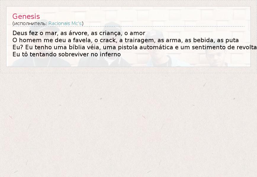 Это интересно:Участники группы Mano Brown, Edi Rock, Ice Blue & DJ KL Jay - выходцы из фавел, располагающихся на окраинах Сан-Паулу, начали выступать в 1980-х годах.В 1988 году была сделана первая запись, вошедшая в сборник "Consciência Black".В 1990 году вышел их первый альбом "Holocausto Urbano".Альбом "Sobrevivendo no Inferno", выпущенный в 1997 году, принес группе достаточно широкую известность (тираж более 500 000 дисков).Тем... продолжение