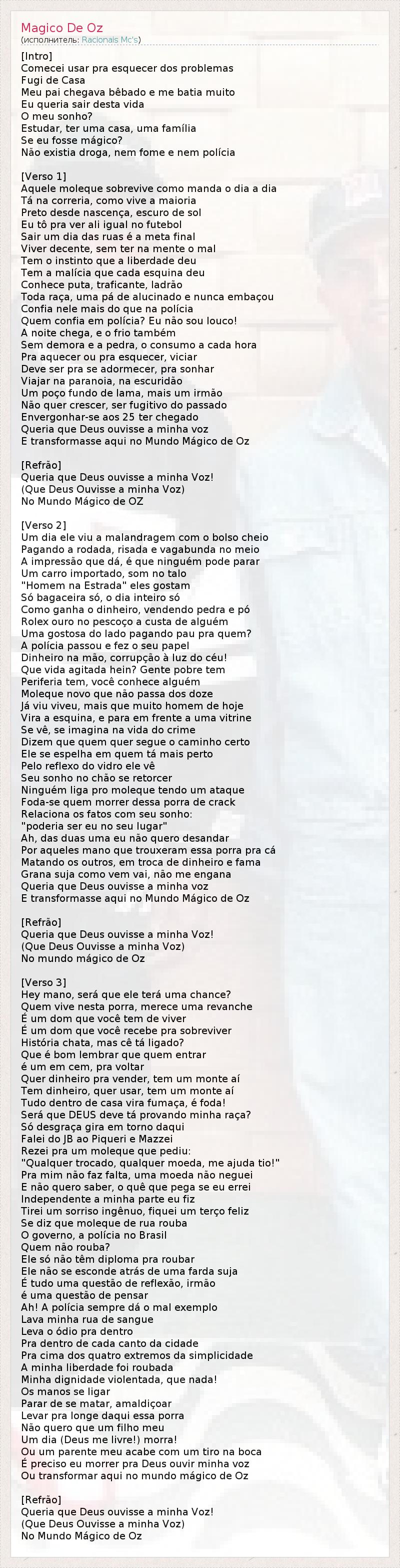 Это интересно:Участники группы Mano Brown, Edi Rock, Ice Blue & DJ KL Jay - выходцы из фавел, располагающихся на окраинах Сан-Паулу, начали выступать в 1980-х годах.В 1988 году была сделана первая запись, вошедшая в сборник "Consciência Black".В 1990 году вышел их первый альбом "Holocausto Urbano".Альбом "Sobrevivendo no Inferno", выпущенный в 1997 году, принес группе достаточно широкую известность (тираж более 500 000 дисков).Тем... продолжение