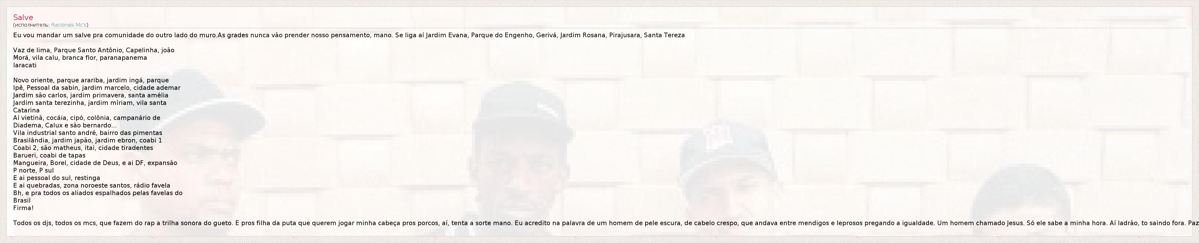 Todos os djs, todos os mcs, que fazem do rap a trilha sonora do gueto. E pros filha da puta que querem jogar minha cabeça pros porcos, aí, tenta a sorte mano. Eu acredito na palavra de um homem de pele escura, de cabelo crespo, que andava entre mendigos e leprosos pregando a igualdade. Um homem chamado Jesus. Só ele sabe a minha hora. Aí ladrão, to saindo fora. Paz