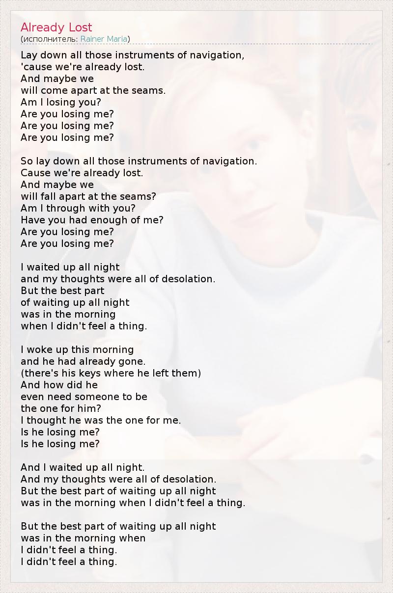 Lay down all those instruments of navigation, 'cause we're already lost. And maybe we will come apart at the seams. Am I losing you? Are you losing me? Are you losing me? Are you losing me? So lay down all those instruments of navigation. Cause we're already lost. And maybe we will fall apart at the seams? Am I through with you? Have you had enough of me? Are you losing me? Are you losing me? I waited up all night and my thoughts were all of desolation. But the best part of waiting up all night was in the morning when I didn't feel a thing. I woke up this morning and he had already gone. (there's his keys where he left them) And how did he even need someone to be the one for him? I thought he was the one for me. Is he losing me? Is he losing me? And I waited up all night. And my thoughts were all of desolation. But the best part of waiting up all night was in the morning when I didn't feel a thing. But the best part of waiting up all night was in the morning when I didn't feel a thing. I didn't feel a thing.
