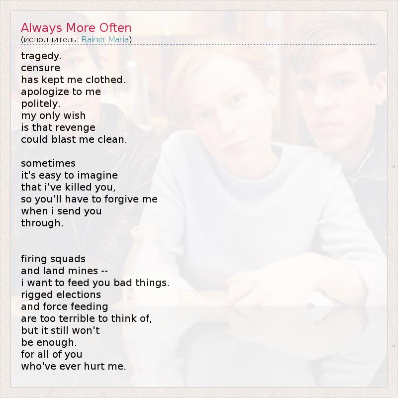Это интересно:Rainer Maria is a three piece emo band from Madison, Wisconsin, later residing in Brooklyn, New York, originally active from 1995 to 2006. Named after the German-language poet Rainer Maria Rilke, Caithlin De Marrais, Kyle Fischer and William Kuehn formed the band in late summer of 1995. They released five full length albums, a live DVD, numerous live recordings, and EPs. In its earlier days, the band had a dual male and female vocal line-up; later, De Marrais would become the lead vocalist in a majority of their songs. The gender ambiguity of the name Rainer Maria paralleled this and was one of the reasons it was selected as the band's name.The band's many tours and intimate live... продолжение