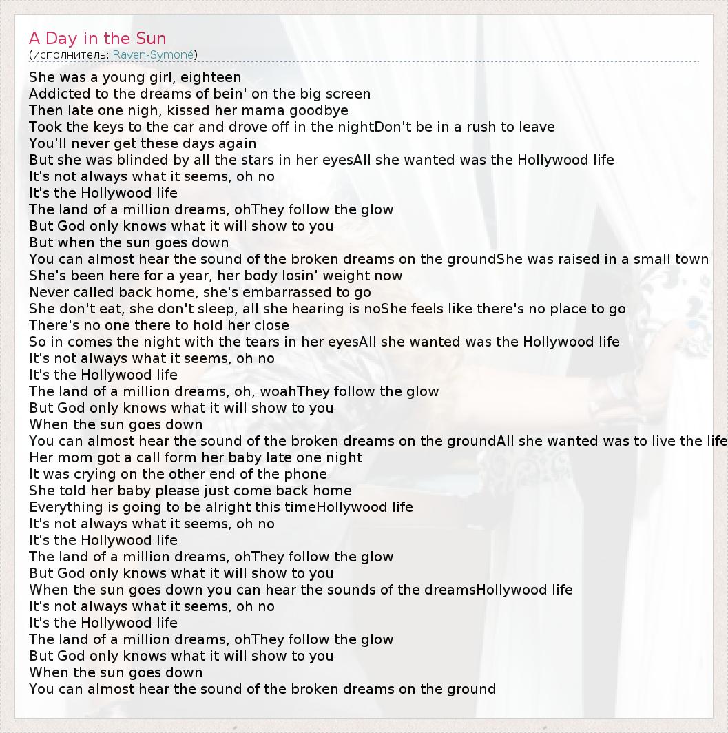She was a young girl, eighteen Addicted to the dreams of bein' on the big screen Then late one nigh, kissed her mama goodbye Took the keys to the car and drove off in the nightDon't be in a rush to leave You'll never get these days again But she was blinded by all the stars in her eyesAll she wanted was the Hollywood life It's not always what it seems, oh no It's the Hollywood life The land of a million dreams, ohThey follow the glow But God only knows what it will show to you But when the sun goes down You can almost hear the sound of the broken dreams on the groundShe was raised in a small town She's been here for a year, her body losin' weight now Never called back home, she's embarrassed to go She don't eat, she don't sleep, all she hearing is noShe feels like there's no place to go There's no one there to hold her close So in comes the night with the tears in her eyesAll she wanted was the Hollywood life It's not always what it seems, oh no It's the Hollywood life The land of a million dreams, oh, woahThey follow the glow But God only knows what it will show to you When the sun goes down You can almost hear the sound of the broken dreams on the groundAll she wanted was to live the life Her mom got a call form her baby late one night It was crying on the other end of the phone She told her baby please just come back home Everything is going to be alright this timeHollywood life It's not always what it seems, oh no It's the Hollywood life The land of a million dreams, ohThey follow the glow But God only knows what it will show to you When the sun goes down you can hear the sounds of the dreamsHollywood life It's not always what it seems, oh no It's the Hollywood life The land of a million dreams, ohThey follow the glow But God only knows what it will show to you When the sun goes down You can almost hear the sound of the broken dreams on the ground