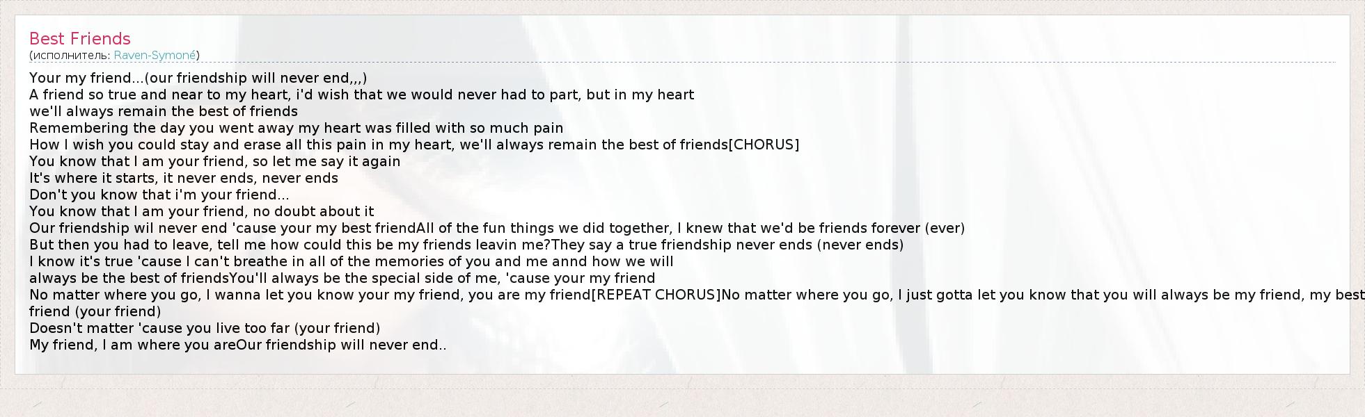 Your my friend...(our friendship will never end,,,) A friend so true and near to my heart, i'd wish that we would never had to part, but in my heart we'll always remain the best of friends Remembering the day you went away my heart was filled with so much pain How I wish you could stay and erase all this pain in my heart, we'll always remain the best of friends[CHORUS] You know that I am your friend, so let me say it again It's where it starts, it never ends, never ends Don't you know that i'm your friend... You know that I am your friend, no doubt about it Our friendship wil never end 'cause your my best friendAll of the fun things we did together, I knew that we'd be friends forever (ever) But then you had to leave, tell me how could this be my friends leavin me?They say a true friendship never ends (never ends) I know it's true 'cause I can't breathe in all of the memories of you and me annd how we will always be the best of friendsYou'll always be the special side of me, 'cause your my friend No matter where you go, I wanna let you know your my friend, you are my friend[REPEAT CHORUS]No matter where you go, I just gotta let you know that you will always be my friend, my best friend (your friend) Doesn't matter 'cause you live too far (your friend) My friend, I am where you areOur friendship will never end..