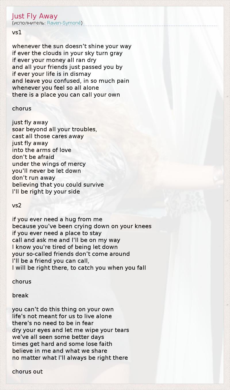 vs1 whenever the sun doesn't shine your way if ever the clouds in your sky turn gray if ever your money all ran dry and all your friends just passed you by if ever your life is in dismay and leave you confused, in so much pain whenever you feel so all alone there is a place you can call your own chorus just fly away soar beyond all your troubles, cast all those cares away just fly away into the arms of love don't be afraid under the wings of mercy you'll never be let down don't run away believing that you could survive I'll be right by your side vs2 if you ever need a hug from me because you've been crying down on your knees if you ever need a place to stay call and ask me and I'll be on my way I know you're tired of being let down your so-called friends don't come around I'll be a friend you can call, I will be right there, to catch you when you fall chorus break you can't do this thing on your own life's not meant for us to live alone there's no need to be in fear dry your eyes and let me wipe your tears we've all seen some better days times get hard and some lose faith believe in me and what we share no matter what I'll always be right there chorus out