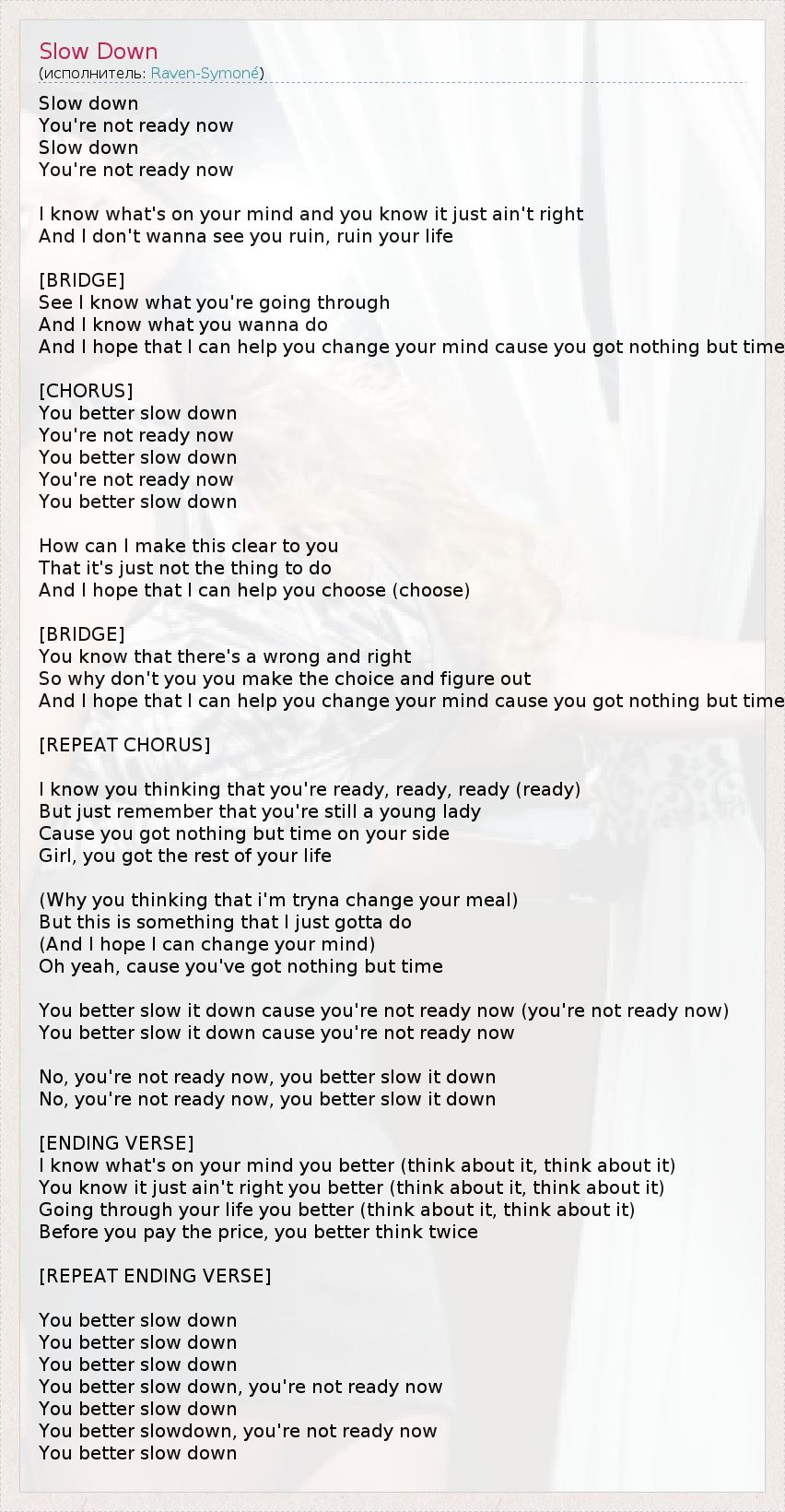 Slow down You're not ready now Slow down You're not ready now I know what's on your mind and you know it just ain't right And I don't wanna see you ruin, ruin your life [BRIDGE] See I know what you're going through And I know what you wanna do And I hope that I can help you change your mind cause you got nothing but time [CHORUS] You better slow down You're not ready now You better slow down You're not ready now You better slow down How can I make this clear to you That it's just not the thing to do And I hope that I can help you choose (choose) [BRIDGE] You know that there's a wrong and right So why don't you you make the choice and figure out And I hope that I can help you change your mind cause you got nothing but time [REPEAT CHORUS] I know you thinking that you're ready, ready, ready (ready) But just remember that you're still a young lady Cause you got nothing but time on your side Girl, you got the rest of your life (Why you thinking that i'm tryna change your meal) But this is something that I just gotta do (And I hope I can change your mind) Oh yeah, cause you've got nothing but time You better slow it down cause you're not ready now (you're not ready now) You better slow it down cause you're not ready now No, you're not ready now, you better slow it down No, you're not ready now, you better slow it down [ENDING VERSE] I know what's on your mind you better (think about it, think about it) You know it just ain't right you better (think about it, think about it) Going through your life you better (think about it, think about it) Before you pay the price, you better think twice [REPEAT ENDING VERSE] You better slow down You better slow down You better slow down You better slow down, you're not ready now You better slow down You better slowdown, you're not ready now You better slow down