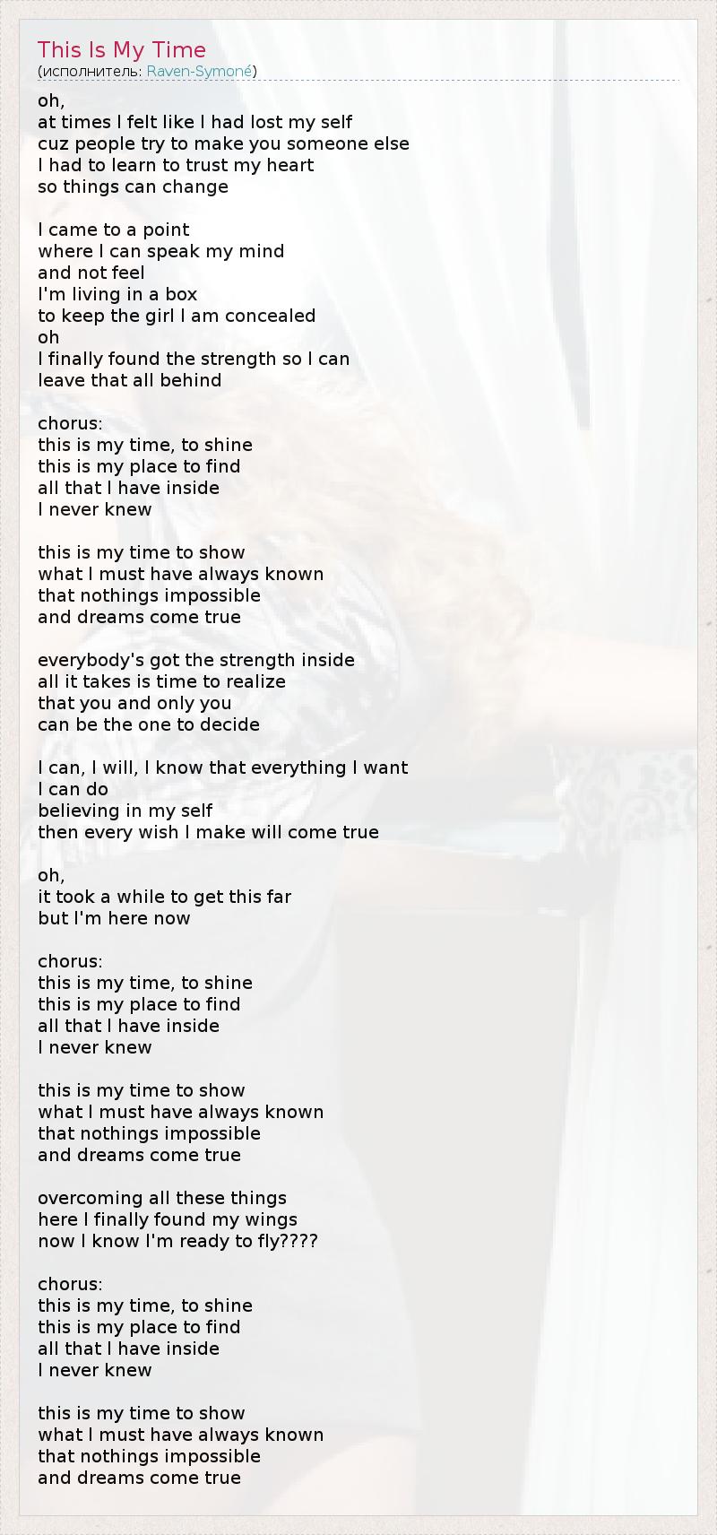 oh, at times I felt like I had lost my self cuz people try to make you someone else I had to learn to trust my heart so things can change I came to a point where I can speak my mind and not feel I'm living in a box to keep the girl I am concealed oh I finally found the strength so I can leave that all behind chorus: this is my time, to shine this is my place to find all that I have inside I never knew this is my time to show what I must have always known that nothings impossible and dreams come true everybody's got the strength inside all it takes is time to realize that you and only you can be the one to decide I can, I will, I know that everything I want I can do believing in my self then every wish I make will come true oh, it took a while to get this far but I'm here now chorus: this is my time, to shine this is my place to find all that I have inside I never knew this is my time to show what I must have always known that nothings impossible and dreams come true overcoming all these things here I finally found my wings now I know I'm ready to fly???? chorus: this is my time, to shine this is my place to find all that I have inside I never knew this is my time to show what I must have always known that nothings impossible and dreams come true
