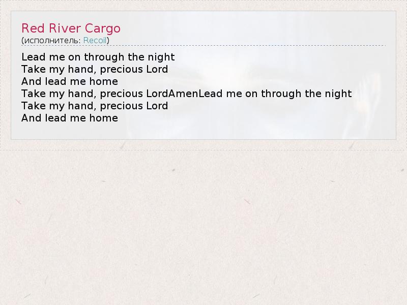 Lead me on through the night Take my hand, precious Lord And lead me home Take my hand, precious LordAmenLead me on through the night Take my hand, precious Lord And lead me home
