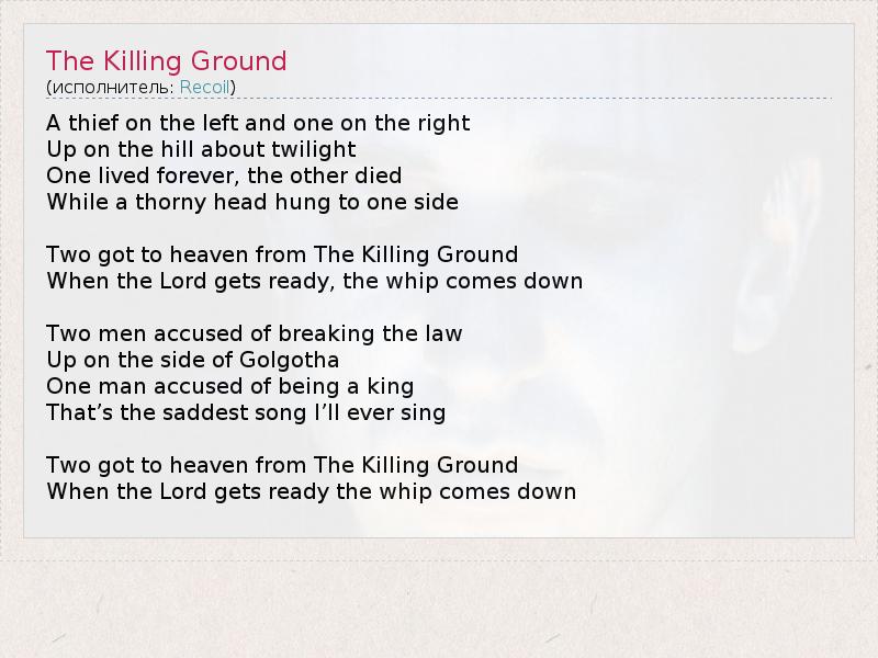 A thief on the left and one on the right Up on the hill about twilight One lived forever, the other died While a thorny head hung to one side Two got to heaven from The Killing Ground When the Lord gets ready, the whip comes down Two men accused of breaking the law Up on the side of Golgotha One man accused of being a king That’s the saddest song I’ll ever sing Two got to heaven from The Killing Ground When the Lord gets ready the whip comes down